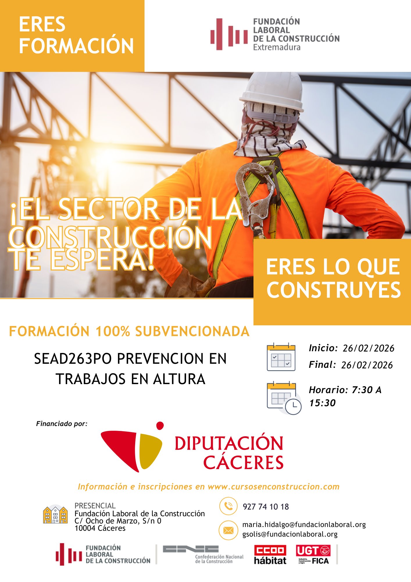 Ya está en marcha la nueva acción formativa del Convenio de colaboración entre la Diputación Provincial de Cáceres y la Fundación Laboral de la Construcción. Formación disponible en dos ediciones.